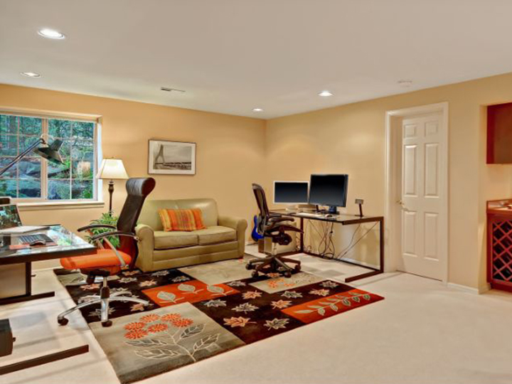 Home staging tip: If you look carefully at the two images, the first thing that you’ll probably notice is that we made the sitting area a little bit lighter, that is we removed the green loveseat and used only one sofa and two chairs (arranged differently) in the living room in order to make it look larger and more open. However, if you look even more attentively you’ll also notice that we used the rug under the table to create this new arrangement. Why? Well, we needed the green loveseat and theĀ other rug for another room downstairs that was in desperate need of color and coziness: