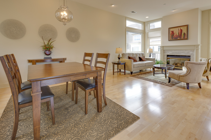 Home staging tip: One of the easiest solutions to decorate large scale walls is to repeat the same element three or more times. For the staging above, we decided to use these light metal circles that, hung side by side, were able to cover a large portion of the wall.