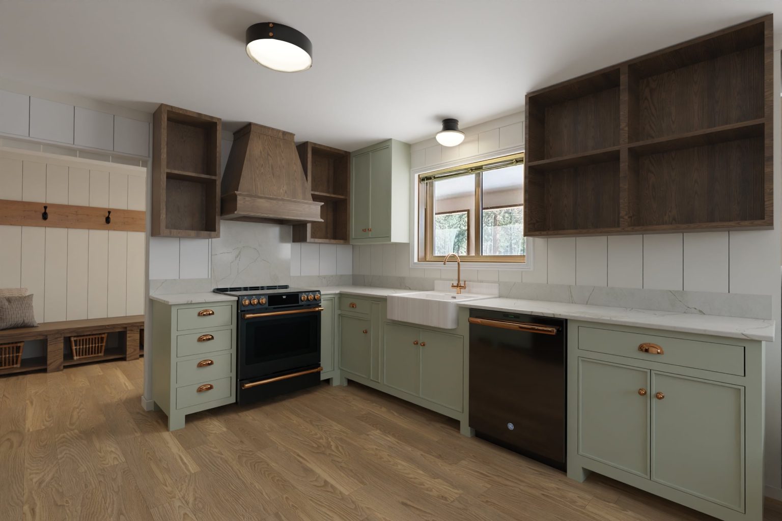 For the third version of the kitchen rendering, we opted for a deeper, more sophisticated color palette by introducing Sherwin Williams’ Retreat SW 6207 for the cabinets. This rich, muted green brought a sense of depth and tranquility to the space, perfectly balancing the modern and rustic elements in the design.