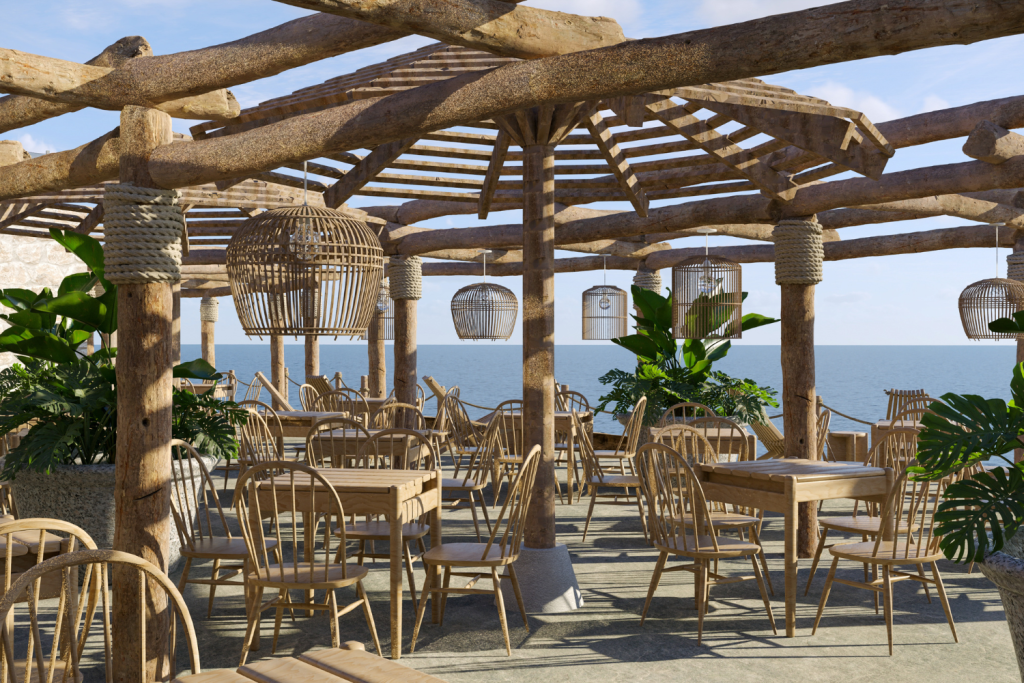 3D render: captures the sense of place and a “signature moment”—a pergola-covered terrace, natural textures, and uninterrupted ocean-facing views.