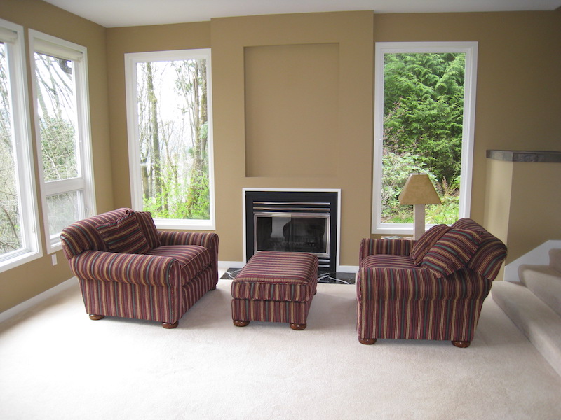 Home staging tip: Symmetry without balance is not effective. The way the room above was furnished was symmetrical but out of balance: the two armchairs were too small for the space, the fireplace was lacking any decoration (an empty niche is calling for accessories), without considering the fact that the armchair on the right was blocking the staircase. We staged this living room taking into consideration the rules and elements of design such as line, direction, size, texture, color, and so on.