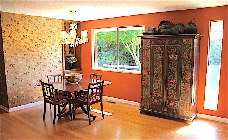 Home staging tip: “The wallpaper is one of the most personal decorative elements one can add to a home, but one of the main rules of home staging is that you must de-personalize the house to help the buyers visualize themselves in it. That means removing the wallpaper as well. However, this suggestion is not always welcomed by the seller, either for personal reasons or for economic ones (getting rid of wallpaper costs time and money). As a result, sometimes stagers have no other choice than to “play” with it. In this case, we tried to keep everything very simple by removing the rug and the curtains which also had a pattern. We made the table smaller (to have the chandelier centered to it) and filled the void by the window with an armoire, whose motif was in line with the pattern of the wallpaper”.